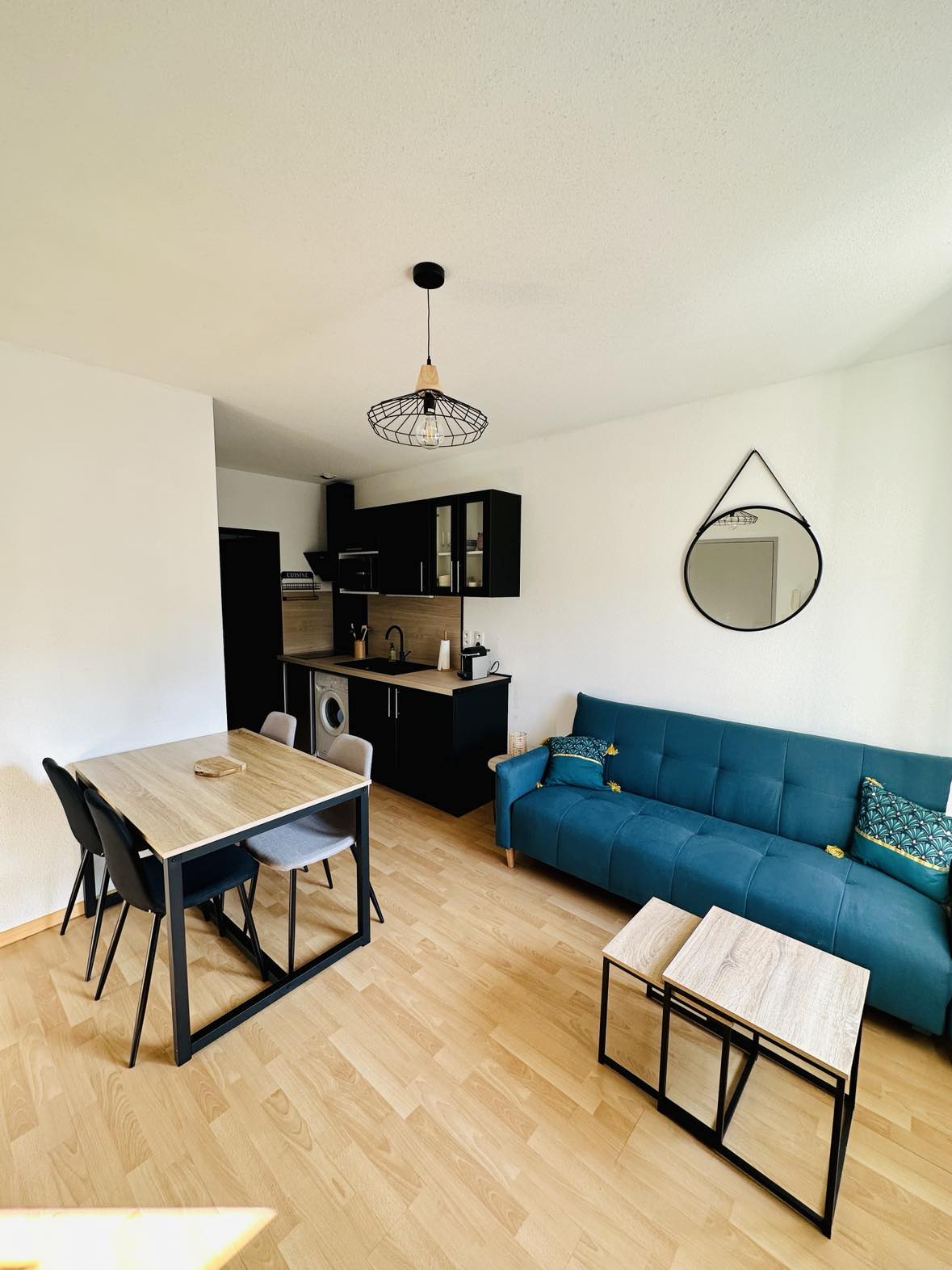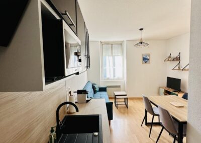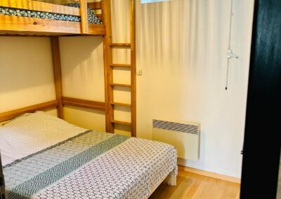 La chambre est équipée d’un lit en 140 cm ainsi que d’un lit mezzanine en 90 cm. Le canapé est convertible. La salle de bain est composée d’une douche ainsi que des toilettes. La cuisine équipée comprend un réfrigérateur, un micro-ondes et une cafetière compatible Nespresso.