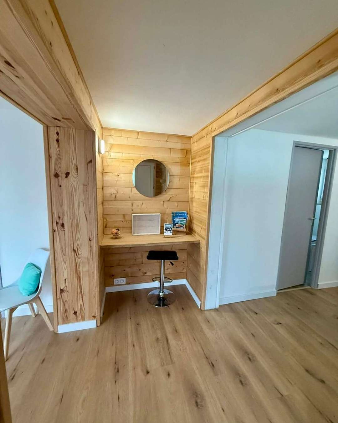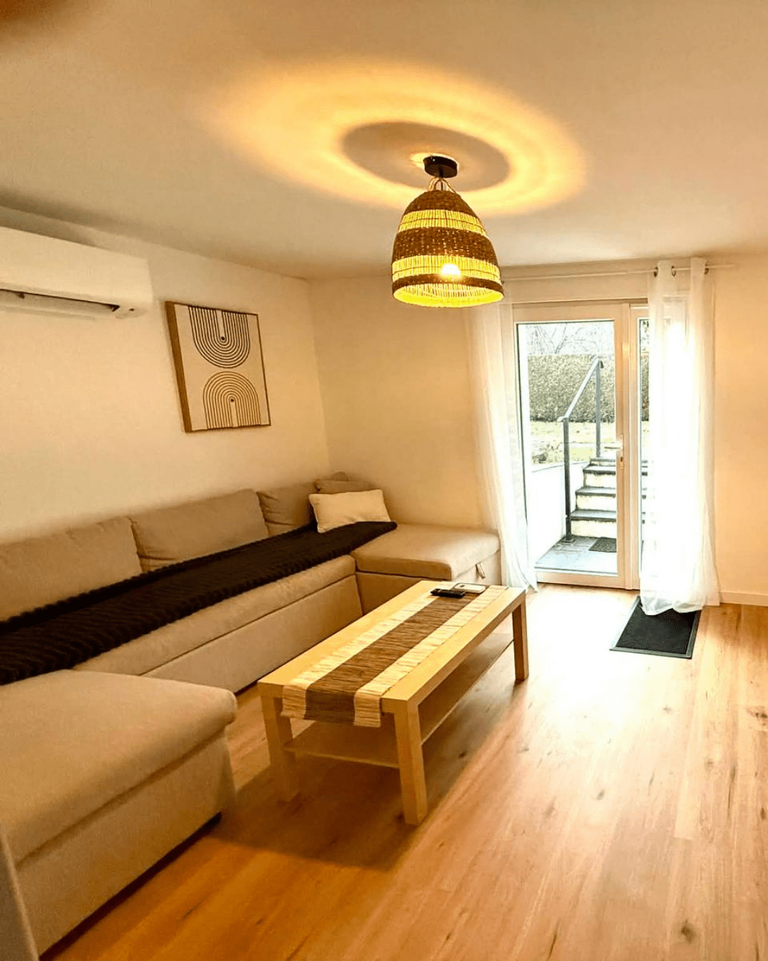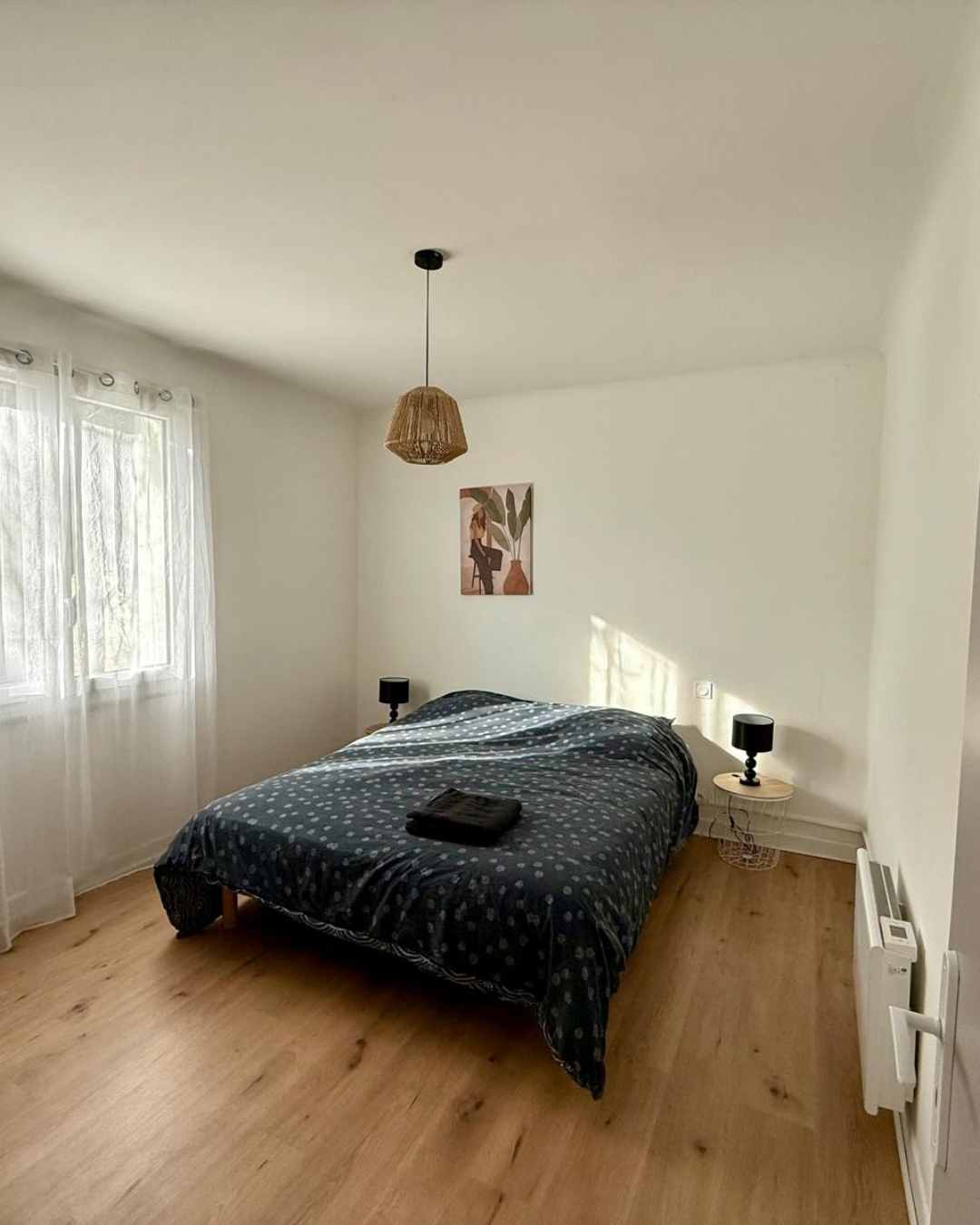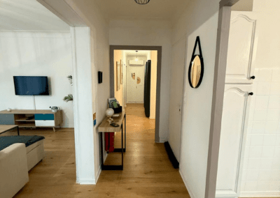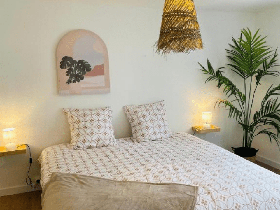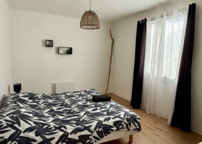 Le logement, situé à l’étage, peut accueillir jusqu’à 8 personnes grâce à ces trois chambres et son canapé convertible.