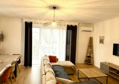 Le salon dispose d’une grande table conviviale, d’un coin télévision avec son canapé convertible ainsi qu’un balcon privatif offrant une vue agréable sur les montagnes environnantes.